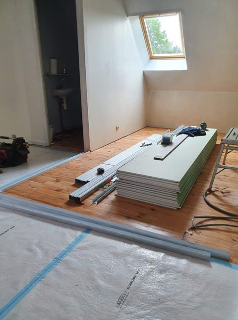 Voilà pour la pose des rails de plaques de platre, nous avons a faire ici à un plancher bois d’origine.