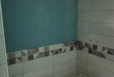 Enfin, nous posons la faîence dans la salle de bain et les toilettes, l’installation de la douche et la pose de la désormais célèbre « Double vasque » !