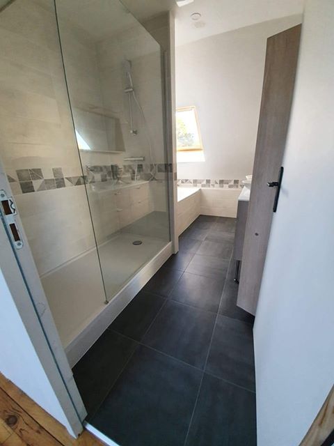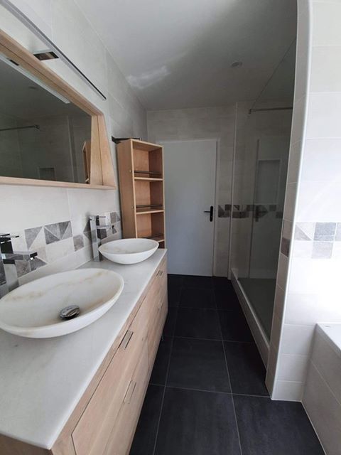 Une nouvelle création se termine…un chantier à Saint Yvi où nous devions nous adapter à une petite structure une salle de bain complète avec douche et baignoire ainsi qu’une double vasque et bien sur tout le travail préparatoire nécessaire. Comme d’habitude Breizh Salle de Bains s’occupe de l’ouvrage de A à Z.