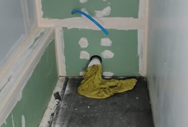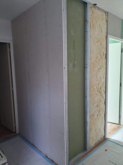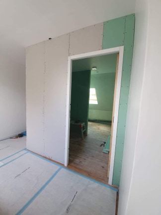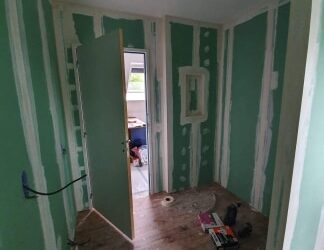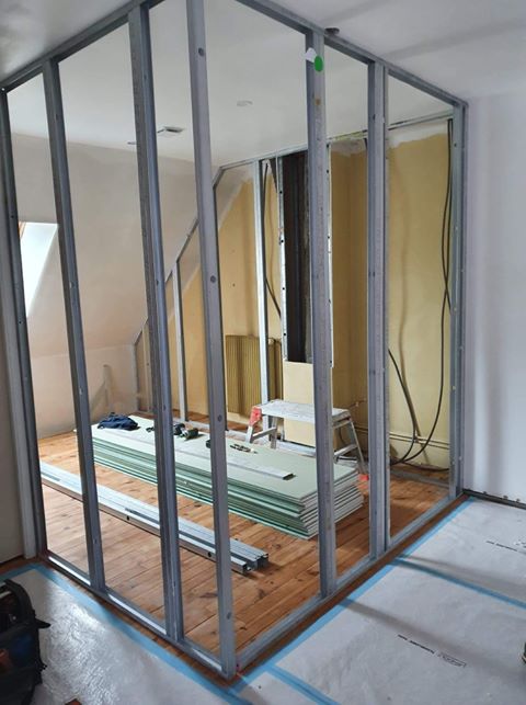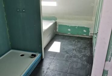 Nous posons les plaques de plâtre hydrofuges adaptées à une pièce humide dans l’espace prévu et également dans les (futures) toilettes attenantes.