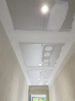 Pour les autres pièces, nous mettons un faux plafond en y intégrant des spots de lumière.