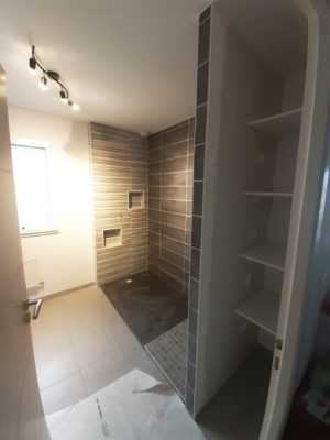 Qui dit gagner de la place, dit également en profiter pour ajouter du rangement ! C’est pourquoi nous avons conçu un étagère de l’autre coté de la douche, bien pratique pour ranger le linge de salle de bain.